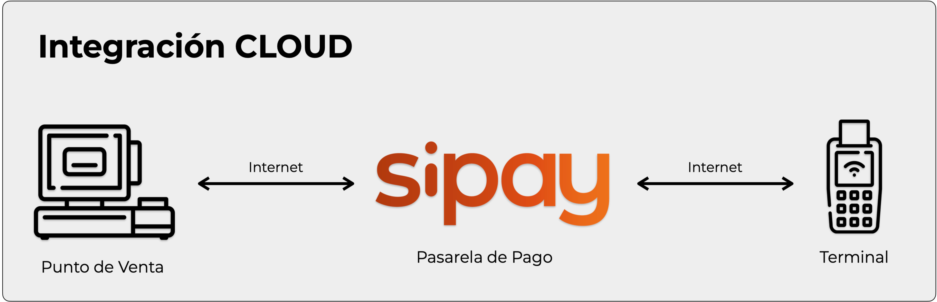 En esta modalidad, la comunicación se realiza a través de la infraestructura cloud de Sipay, que actúa como puente seguro entre el POS (punto de venta) y el terminal. Esto permite que comercios con arquitecturas de red complejas o distribuidas puedan implementar PayGate sin modificar su infraestructura existente.